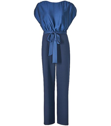 Eleganter Damen Jumpsuit aus Chiffon Rundhalsausschnitt Angeschnittene Ärmel Raffung an den Schultern Bindeband bei der Taille Rückenteil mit Cut Out und Knopf zum öffnen Anliegend geschnitten Seitliche Eingrifftaschen Gerader Beinverlauf Unifarben Farbbezeichnung: Navy Material: 98% Polyester, 2% Elasthan ...