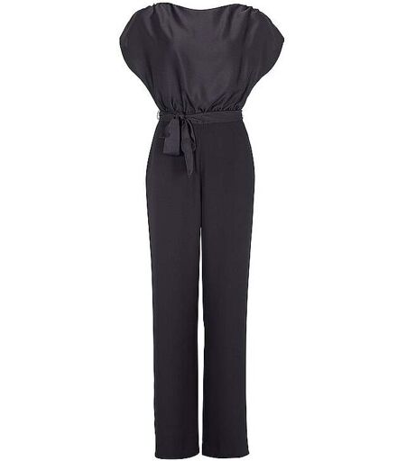 Eleganter Damen Jumpsuit aus Chiffon Rundhalsausschnitt Angeschnittene Ärmel Raffung an den Schultern Bindeband bei der Taille Rückenteil mit Cut Out und Knopf zum öffnen Anliegend geschnitten Seitliche Eingrifftaschen Gerader Beinverlauf Unifarben Farbbezeichnung: Black Material: 98% Polyester, 2% Elasthan ...