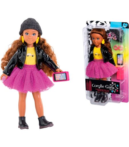 Die Ankleidepuppe Melody New York Fashion Week aus der Serie Corolle Girls hat langes, braunes Haar und trägt ein modisches Outfit mit pinkem Rock, einer schicken Lederjacke und trendiger Kopfbedeckung. So ist Melody bereit für die New York Fashion Week und hat vier Accessoires dabei: Mit dabei sind ein Smartphone mit Hülle, ein Paar abnehmbarer Ohrringe und eine Mütze. Wie alle Corolle-Puppen riecht Melody angenehm nach Vanille. Sie ist etwa 28 Zentimeter groß, hat gemalte Augen und kann selbstständig stehen und sitzen. ...