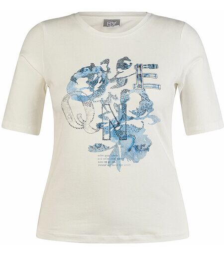 Damen T-Shirt aus Baumwoll-Stretch Rundhalsausschnitt Halbarm Floraler Print im Vorderteil Gerade Passform Farbbezeichnung: Natur Material: 95% Baumwolle, 5% Elasthan ...