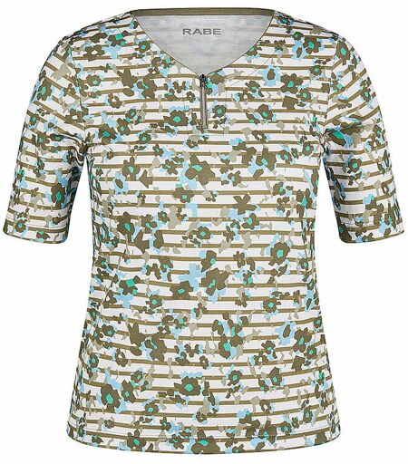 Damen T-Shirt aus Jersey V-Ausschnitt mit Reißverschluss Halb Arm Ringelmuster Floraler Print Schmale Passform Farbbezeichnung: Eukalyptus Material: 100% Baumwolle ...