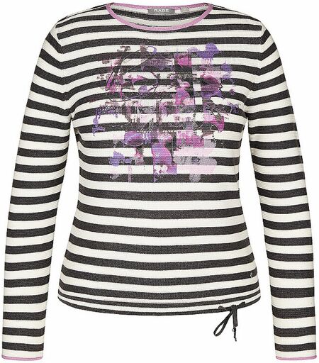 Damen Pullover aus Baumwoll-Mix Rundhalsausschnitt Langarm Ringelmuster Allover Floraler Print auf der Brust Gerade geschnitten Saumende mit Tunnelzug Farbbezeichnung: Granit Material: 50% Baumwolle, 50% Polyacryl ...
