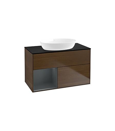 Villeroy und Boch Finion Waschtischunterschrank FA12HGGN 100cm, Abdeckplatte black matt, Regale Midnight matt lacquer, Walnut veneer
