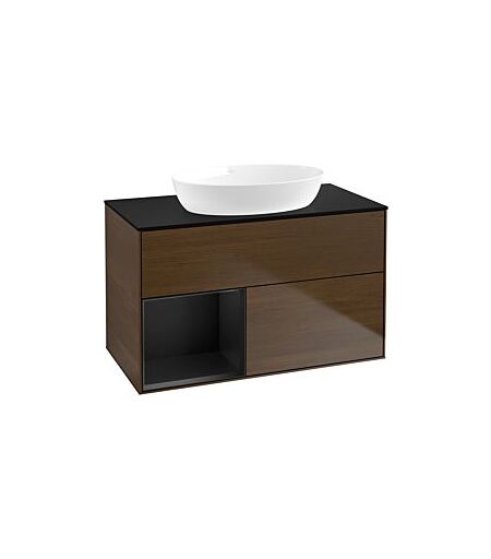 Villeroy und Boch Finion Waschtischunterschrank FA12PDGN 100cm, Abdeckplatte black matt, Regale Black matt lacquer, Walnut veneer