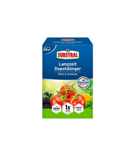 SUBSTRAL® Langzeit Obst- & Gemüsedünger 750,0 g: praktische Profi-Technologie für reiche ErnteSUBSTRAL® Langzeit Obst- & Gemüsedünger 750,0 g ist die innovative Lösung für eine bedarfsgerechte Nährstoffversorgung Ihrer Gemüsepflanzen und Obstbäume. Mit diesem Produkt können Sie hochwertige Ergebnisse erzielen und die Fruchtbarkeit Ihrer Pflanzen optimal unterstützen.Vorteile des Langzeit DepotdüngersNur einmal pro Jahr düngenIntelligente bedarfsgerechte DüngungSofort- und 6-Monate LangzeitwirkungEffiziente Anwendung mit geringen AufwandmengenMinimiert das Risiko von ÜberdüngungSchonend für das Grundwasser durch reduzierte NährstoffauswaschungProfi-Technologie für maximale WirkungDer SUBSTRAL® Langzeit Depotdünger nutzt eine intelligente Düngertechnologie, die aus dem Profibereich stammt. Diese ermöglicht eine bedarfsgerechte Düngung mit Sofort- und Langzeitwirkung bei nur einer Anwendung pro Jahr.AnwendungDer ideale Zeitpunkt für die Anwendung des Langzeit Depotdüngers ist im Frühjahr bis spätestens Juni. Hier sind die Schritte für Neupflanzungen und bestehende Pflanzungen:Bei Neupflanzungen:Substral Dünger und Erde vermischenPflanzgefäß oder Pflanzloch mit gedüngter Erde auffüllenPflanzen setzen, mit vorgedüngter Erde auffüllen, andrücken und gut wässernBei bestehenden Pflanzungen:Dünger im Wurzelbereich um die Pflanzen ausstreuen und leicht einarbeitenAlternativ Löcher bohren und Dünger einbringenDer Substral Langzeit Depotdünger sorgt nicht nur für eine reiche Ernte und geschmacksintensives Gemüse und Obst, sondern ist auch unbedenklich für Kinder und Haustiere. Jetzt SUBSTRAL® Langzeit Obst- & Gemüsedünger 750,0 g bestellen und Ihre Pflanzen den ganzen Sommer optimal versorgen!Bitte beachten Sie die Gefahren- und Sicherheitshinweise:Gefahrenhinweise:- Schädlich für Wasserorganismen, mit langfristiger WirkungSicherheitshinweise:- Inhalt/Behälter mit Restinhalt einer Sammelstelle für gefährliche Abfälle und Sondermüll gemäß lokalen, regionalen, nationalen und/oder internationalen Vorschriften zuführen.Signalwort: -Gefahrenklasse/-kategorie:- Chronisch gewässergefährdend, Kategorie 3 ...