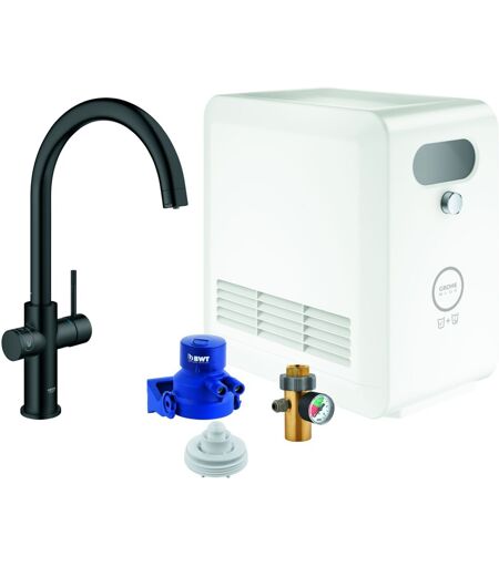 GROHE C-Auslauf Set GROHE Blue Professional 31323_2, mit GROHE Blue Einhand-Spültischbatterie mit Filterfunktion, Einlochmontage, Kühler/Karbonisator, Bluetooth 4.0, WIFI Datenkommunikation, velvet black, 31323KS2 GROHE Blue Professional C-Auslauf Set GROHE Blue Einhand-Spültischbatterie mit Filterfunktion Einlochmontage Drucktasten für 3 gefilterte und gekühlte Tafelwasserarten still, medium, sprudelnd GROHE SilkMove 28 mm Keramikkartusche schwenkbarer Rohrauslauf Schwenkbereich 150° getrennte Wasserführung für gefiltertes und ungefiltertes Wasser flexible Anschlussschläuche GROHE Blue Professional Kühler liefert 12 Liter gekühltes, sprudelndes Wasser pro Stunde Farbdisplay mit Drück- und Drehregler 270 Watt Kühleinheit, 230V, 50Hz Lautstärke im Standby Betrieb 46 dB(A) Schutzart IP 21, CE-Zeichen benötigt Ventilationsöffnungen im Boden des Küchenschranks Anzeige und Überwachung von Verbrauchsdaten, Filter- bzw. CO2-Kapazität über GROHE Watersystems App Push Benachrichtigung bei niedriger Filter- bzw. CO2-Kapazität zusätzliche Überwachung über das GROHE Blue Professional Online-Dashboard möglich mit Bluetooth 4.0* und WIFI Datenkommunikation für Apple** und Android Geräte Reichweite bis zu 10 m abhängig von Wand- und Bodenbelägen Adapter für Reinigungskartusche 40 434 001 Filterkopf mit flexibler Wasserhärteeinstellung CO2 Druckanzeiger Der für die Inbetriebnahme notwendige GROHE Blue Filter, die 2 kg CO2 Flasche (40 423 000) und die Reinigungskartusche (40 434 001) sind nicht im Lieferumfang enthalten und müssen separat bestellt werden Passende Filter: - Filter S-Size, Kapazität 600 Liter bei 20° dKH (40 404 001) - Filter M-Size, Kapazität 1500 Liter bei 20° dKH (40 430 001) - Filter L-Size, Kapazität 2500 Liter bei 20° dKH (40 412 001) - Aktivkohlefilter, Kapazität 3000 Liter (40 547 001) - Ultrasafe Filter, Kapazität 3000 Liter (40 575 002) - Magnesium+ Zink Filter, Kapazität 400 Liter bei 17° dGH (40 691 002) ...