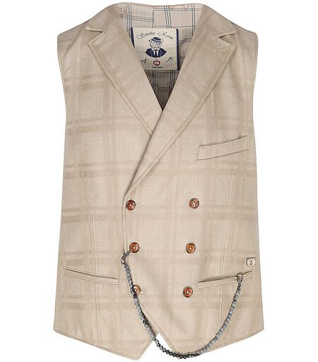 Herren Gilet aus Schurwolle Reverskragen Ohne Arm Eingriffstaschen Schließt mit zweireihiger Knopfleiste Ketten-Detail Dezentes Karomuster Schnalle am Rücken Glattes Innenmaterial Farbbezeichnung: Beige Material: 80% Schurwolle, 13% Polyester, 7% Polyamid Futter: 65% Polyester, 35% Baumwolle ...