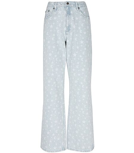 Modische Damen Jeans aus reinem Baumwoll-Denim Mittlere Leibhöhe Schließt mit Knopf- und Reißverschluss 5-Pocket-Style Logo-Stickerei auf der rechten Eingrifftasche und rechten Gesäßtasche Sternen- und Logoprint auf der Vorder- und Rückseite Logo-Patch am Bund hinten Gerades Bein Farbbezeichnung: Blue Material: 100% Baumwolle ...