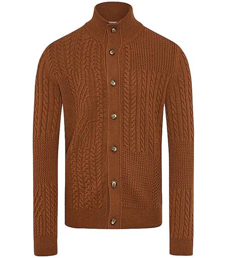 Herren Strickjacke aus Woll-Viskose-Mischung Stehkragen Schließt mit Knopfleiste Langarm Zopfstrickmuster Schmale Passform Unifarben Farbbezeichnung: 54 Toffee Material: 50% Wolle, 25% Viskose, 25% Polyamid ...