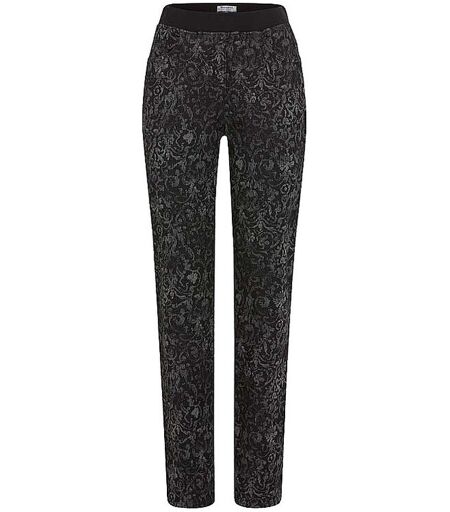 Damen Hose aus Baumwoll-Mischung mit Stretch-Anteil Elastischer Bund Allover Ornamentmuster Konischer Beinverlauf Farbbezeichnung: 02 Black Material: 92% Baumwolle, 6% Polyester, 2% Elasthan ...