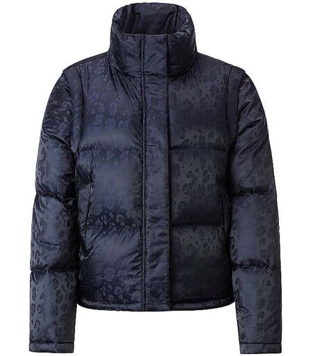 Damen Steppjacke aus pflegeleichtem Nylon-Gewebe Voluminöser Stehkragen und verstaubare, verstellbare Kapuze Schließt mit verdecktem Reißverschluss und Drucknöpfe Mit weicher Füllung Langarm Gerade geschnitten Leo-Print Muster Farbbezeichnung: Midnight Blue Material: 100 % Polyamid ...