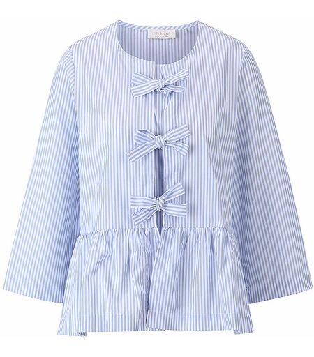 Niedliches Damen Blusenshirt aus reiner Baumwolle Rundhalsausschnitt Schließt mit Bändern 3/4 Ärmel Dezentes Streifenmuster Volant am Saum Gerade Passform Farbbezeichnung: Skyway Blue Material: 100% Baumwolle ...