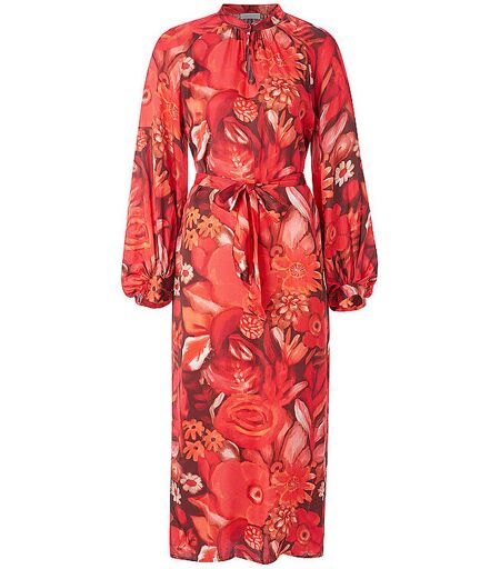 Damen Midikleid aus Viskose-Mischung Stehkragen Lange Ballonärmel mit schmalem Bündchen Bindegürtel in der Taille Floraler Alloverprint Wadenlang Farbbezeichnung: Holiday Red Material: 100% Viskose ...