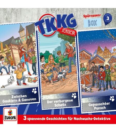 TKKG Junior - Folge 07: Zwischen Gauklern und Ganoven. Auf dem Mittelaltermarkt der Millionenstadt herrscht buntes Treiben. Jongleure, Bogenschützen und Wahrsager begeistern die Besucher mit ihrer Kunst - und TKKG sind mittendrin. Doch plötzlich taucht Falschgeld in der Menge auf. Wer hat die Scheine in Umlauf gebracht? Zwischen Gauklern und Ganoven begeben sich die vier Detektive auf die Suche nach dem Übeltäter. TKKG Junior - Folge 08: Der verborgene Schatz. Karl hat von seinem Bruder eine Metallsonde geschenkt bekommen. TKKG wollen damit im Preußen-Park sofort auf Schatzsuche gehen. Werden sie tatsächlich etwas finden? Und wer sind die beiden seltsamen Gestalten, die sie verfolgen? Und führt das Loch in der Erde wirklich in eine Räuberhöhle? TKKG Junior - Folge 09: Gepanschter Punsch. Adventszeit in der Millionenstadt. Doch auf dem Öko-Weihnachtsmarkt geht es gar nicht besinnlich zu. Jemand scheint etwas in die Getränke und ins Essen zu mischen. Etliche Gäste klagen über Bauchweh und Übelkeit. Als auch der Punsch-Stand von Frau Glockner ins Visier der Täter gerät, übernehmen TKKG den Fall. ...