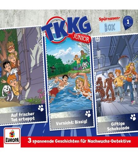 "TKKG Junior - Folge 01: Auf frischer Tat ertappt. Eine Einbruchserie hält die Millionenstadt in Atem. Die Zielobjekte sind jedes Mal Häuser im teuren Villenviertel. Die Polizei tappt völlig im Dunkeln. Es gibt nicht die geringste Spur von den Tätern. Als Karl durch Zufall Zeuge einer geheimen Unterhaltung wird, kommen TKKG den Dieben auf die Spur! TKKG Junior - Folge 02: Vorsicht: Bissig! Im ""Loch Ness"", einem Badesee in der Millionenstadt, geht Seltsames vor. Schwimmer werden aus der Tiefe des Baggerlochs angegriffen, kommen zum Glück aber mit dem Schrecken davon. Alles rätselt, wer oder was da im See sein Unwesen treibt. TKKG beschließen, dem Geheimnis auf den Grund zu gehen... TKKG Junior - Folge 03: Giftige Schokolade. In der Schokoladenfabrik geht es drunter und drüber: Die Schokolade ist versalzen und das Geheimrezept verschwunden. Können TKKG den Übeltäter finden? Als auch noch ein Glasauge in der Schokolade auftaucht, ist klar, die vier Detektive haben es mit echten Halunken zu tun! Ein klarer Fall für TKKG!" ...