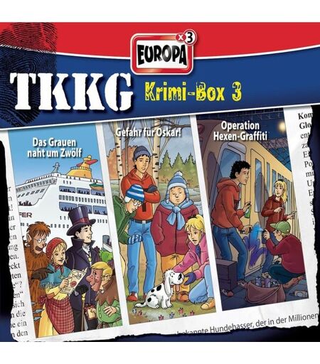 "TKKG Krimi-Box 03: Folge 160: Das Grauen naht um Zwölf. TKKG können ihr Glück nicht fassen! Gaby hat bei einem Halloween-Kostüm-Entwurf-Wettbewerb den ersten Preis gewonnen und darf mit ihren drei besten Freunden an einer Wochenendtour auf dem Luxus-Liner ""Lucifer"" teilnehmen. Schon nach kurzer Zeit ereignen sich auf dem Traumschiff unheimliche Dinge: Eine Geistererscheinung sorgt für Unruhe, ein Gast löst sich scheinbar in Luft auf und kehrt nicht mehr zurück... Folge 162: Gefahr für Oskar! Wer ist der unbekannte Hundehasser, der in der Millionenstadt gefährliche Köder auslegt? Als Gabys Hund Oskar beinahe das Opfer des fiesen Verbrechers wird, werden TKKG aktiv! Und schon bald zeigt sich eine erste Spur. Folge 164: Operation Hexen-Graffiti. Kommissar Glockner ist entsetzt: zahlreiche Einsatzwagen der Polizei wurden mit Graffiti besprüht! Und ein Ende dieser skrupellosen Sachbeschädigung ist nicht abzusehen. Wer steckt hinter der berüchtigten ""Hexen-Bande""? Als ""Undercover-Agenten"" schleusen sich TKKG in die Graffiti-Szene ein..." ...