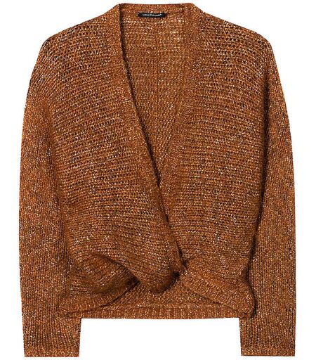 Gestrickter Cardigan aus Tweed-Garn mit hohem Baumwollanteil und glitzerndem Metallgarn. Zwei stoffbezogene Druckknöpfe im unteren Bereich ermöglichen eine legere Drapierung des abgerundeten Saums. Tiefer V-Ausschnitt Langarm Unifarben Lockere Passform Farbbezeichnung: Kurkuma Material: 40% Baumwolle, 24% Alpaka, 18% Polyamid, 11% Wolle, 7% Polyester metallisiert ...