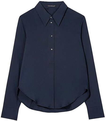 Sportliche-elegante Bluse aus reiner Baumwolle mit abgerundetem, seitlich geschlitztem Saum. Highlight sind die goldfarbenen Knöpfe in Knotenform, die die halbe Knopfleiste und die Ärmelmanschetten zieren. Damen Bluse aus reiner Baumwolle Hemdblusenkragen Halbe Knopfleiste Langarm mit Manschetten Abgerundeter Saumabschluss Gerade Passform Unifarben Farbbezeichnung: Jeans Blue Material: 100% Baumwolle ...