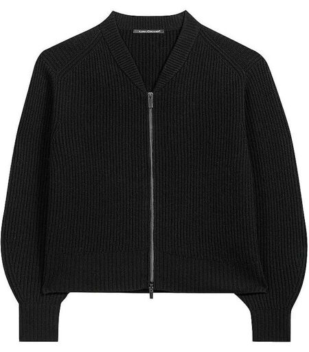 Damen Strickjacke in Blouson-Optik aus Woll-Kaschmir-Mischung Rundhalsausschnitt mit schmalem Kragen Schließt mit Zwei-Wege-Reißverschluss Langarm Gerippte Struktur Gerade Passform Unifarben Farbbezeichnung: Deep Black Material: 90% Wolle, 10% Kaschmir ...