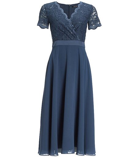 Damen Abendkleid aus Spitze- Chiffon Mix V-Ausschnitt in Wickeloptik Kurzarm Oberteil aus Spitze Rockteil aus Chiffon Midilänge Farbbezeichnung: Timeless Blue Material: 100% Polyester ...