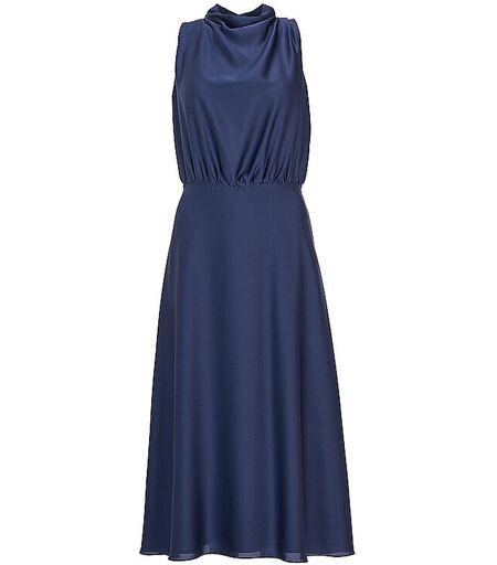 Elegantes Damen Abendkleid aus Satin Stehkragen mit Drapierung Ohne Arm Schließt mit Reißverschluss in der hinteren Mitte Raffung in der Taille Taillierte Passform Unterknielänge Unifarben Farbbezeichnung: Future Blue Material: 100% Polyester ...