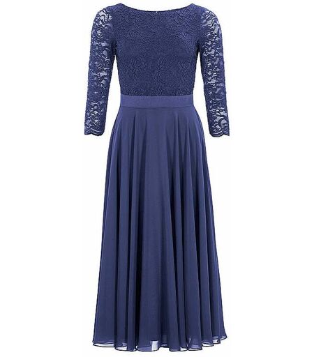Elegantes Damen-Abendkleid aus fließendem Chiffon mit feiner Struktur Oberteil aus romantischer Spitze U-Boot-Ausschnitt Reißverschluss an der Rückseite 3/4 Ärmel Unifarben Leichtes, glattes Futter Ausgestellter Rockteil Gürtel in schimmernder Satin-Optik an der Mitte Gesamtlänge: ca. 125cm Farbbezeichnung: Future Blue Material: 100% Polyester ...