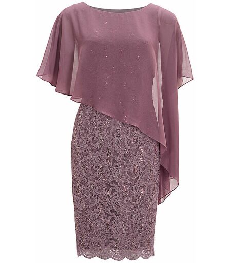 Damen-Kleid aus romantischer Allover-Spitze Fixiertes Cape aus fließendem Chiffon Rundhalsausschnitt Fledermausärmel Körpernahe Passform Knieumspielend Leichtes Futter aus Microfaserjersey Farbbezeichnung: Mauve Material: 100% Polyester Futter: 95% Polyester 5% Elasthan ...