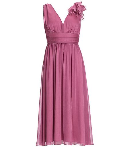 Damen Abendkleid aus Crinkle Chiffon V-Ausschnitt Ohne Arm Volant Detail an der Schulter Schließt mit Reißverschluss in der hinteren Mitte Taillierte Passform Unifarben Farbbezeichnung: Raspberry Pink / Multi Material: 100% Polyester ...