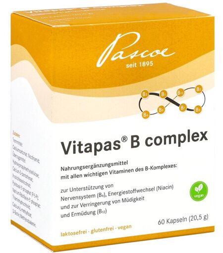 * B-Vitamine (gem. Health-Claims-VO)Wirkstoffe / Inhaltsstoffe / ZutatenZutaten von Vitapas B Complex Kapseln: Trennmittel: Calciumcarbonat Nicotinamid Überzugsmittel: Hydroxypropylmethylcellulose Calcium-D-pantothenat Inositolhexanicotinat Pyridoxal-5'-phosphat (P-5-P) Natrium-Riboflavin-5'-phosphat Thiaminhydrochlorid Calcium-L-methylfolat D-Biotin Methylcobalamin.