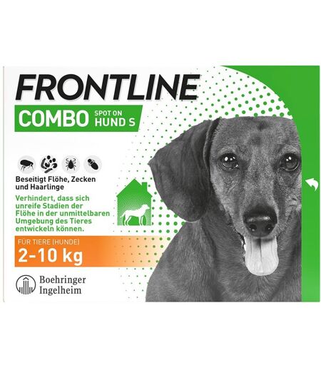 Anwendungsgebiet von FRONTLINE COMBO® Spot On Hund S 2-10 kgFRONTLINE COMBO® Spot On Hund S 2-10 kg - Lösung zum Auftropfen auf die Haut, für Hunde - Gegen Zecken, Flöhe und Haarlinge bei Hunden. Hemmt auch die Entwicklung von Floheiern, Flohlarven und Flohpuppen in der Umgebung.