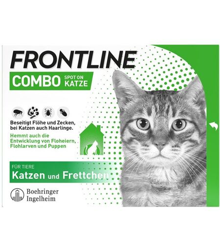 Anwendungsgebiet von FRONTLINE COMBO KatzeFRONTLINE COMBO Katze - Lösung zum Auftropfen auf die Haut, für Katzen und Frettchen - Gegen Zecken, Flöhe und Haarlinge bei Katzen und Frettchen. Hemmt auch die Entwicklung von Floheiern,