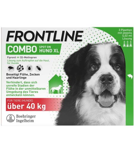 Anwendungsgebiet von FRONTLINE COMBO® Spot On Hund XL >40 kgFRONTLINE COMBO® Spot On Hund XL >40 kg - Lösung zum Auftropfen auf die Haut, für Hunde - Gegen Zecken, Flöhe und Haarlinge bei Hunden. Hemmt auch die Entwicklung von Floheiern, Flohlarven und Flohpuppen in der Umgebung.