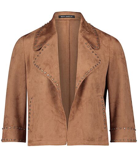 Damen Jäckchen in Velours-Optik Reverskragen Ohne Verschluss 3/4 Arm Nieten-Details an Kragen und Ärmel Seitlich Eingrifftaschen Gerade Passform Unifarben Farbbezeichnung: Classic Nougat Material: 92% Polyester, 8% Elasthan ...