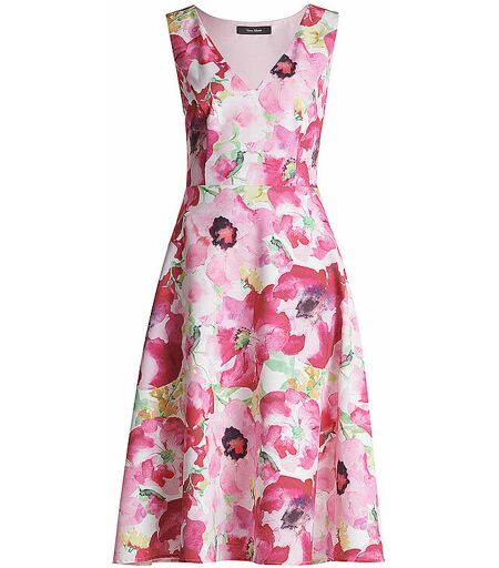 Elegantes Damen Cocktailkleid aus Material-Mix Tiefer V-Ausschnitt Ohne Arm Schließt mit Reißverschluss Seitliche Eingrifftaschen Floraler Alloverprint Ausgestellte Passform Länge: Ca. 114 cm Farbbezeichnung: Cream / Rosé Material: 90% Polyester, 10% Elasthan Futter: 100% Polyester ...