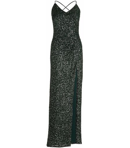 Elegantes Damen Abendkleid aus glitzerndem Material V-Ausschnitt Schmale Träger Schließt mit Reißverschluss Bänder zum Binden im Rückenteil Langer Seitenschlitz Figurbetonte Passform Länge: Ca. 152 cm Länge ab Taille: 110 cm Farbbezeichnung: Dusty Slate Material: 95% Polyester, 5% Elasthan ...
