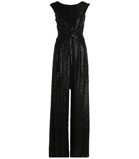 Eleganter Damen Jumpsuit Rundhalsausschnitt Ohne Arm Schließt mit Reißverschluss Seitliche Nahttaschen Raffung vorne Figurbetonte Passform Normale Länge Farbbezeichnung: Black / Black Material: 86% Polyamid, 9% metallisiert Polyester, 5% Elasthan ...