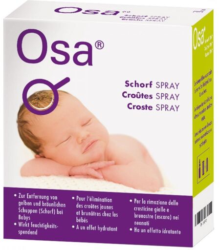 Anwendungsgebiet von Osa Schorf SprayDie Schuppen auf Babys Köpfchen sind das Ergebnis einer Überproduktion an natürlichem Talg. Der Kopfgneis kann auf der Kopfhaut, um die Augenbrauen, Augenlider und Ohren oder am Hals des Kindes in Erscheinung treten und lässt sich mit unserem rein pflanzlichen Osa Schorf Spray bestens entfernen.Wirkungsweise von Osa Schorf SprayOsa Schorf Spray beinhaltet rein pflanzliche Wirkstoffe wie beispielsweise Borretschsamenöl („Gurkenkraut“), Sonnenblumenöl, Rosmarinextrakt und auch Vitamin E. Das Produkt wurde eigens zur Entfernung von Kopfgneis entwickelt und enthält eine genau darauf abgestimmte Zusammensetzung der Bestandteile. Das Ölgemisch befeuchtet die trockenen Schuppen und erleichtert dabei das Ablösen von der Kopfhaut. Zudem fördert es den Heilungsprozess und wirkt rückfettend, durchblutungsfördernd sowie pflegend.Wirkstoffe / Inhaltsstoffe / ZutatenWirkstoffe von Osa Schorf Spray: