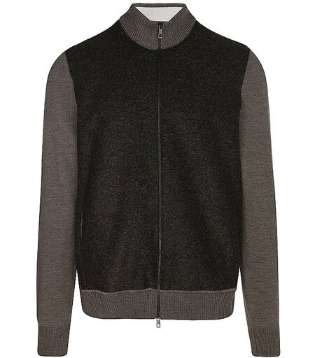 Herren Strickjacke mit Wollanteil Stehkragen Langarm Schließt mit Zwei-Weg-Reißverschluss Gerippte Bündchen an Ärmel und Saum Color Blocking Gerade geschnitten Farbbezeichnung: Hardwood Material: 45% Polyester 40% Polyacryl 15% Wolle ...