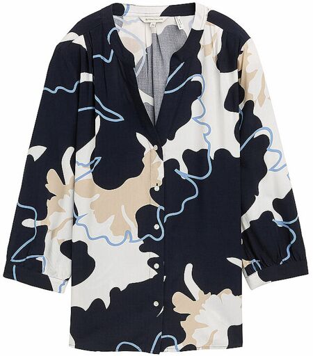 Damen Bluse aus fließender Viskose Tunikaausschnitt 3/4 Ärmel Großer floraler Print Schließt mit Knopfleiste Lockere Passform Farbbezeichnung: Big Floral shapes Design Material: 100% Viskose (LENZING™ ECOVERO™) ...