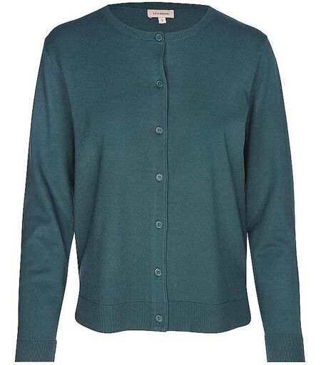 Damen Strickjacke aus Viskose-Mischung Gerippter Rundhalsausschnitt Schließt mit Knopfleiste Langarm Rippbündchen an Ärmel und Saum Kurze Seitenschlitze Hoher Tragekomfort Unifarben Farbbezeichnung: Efeu Material: 72% Viskose, 28% Polyester ...