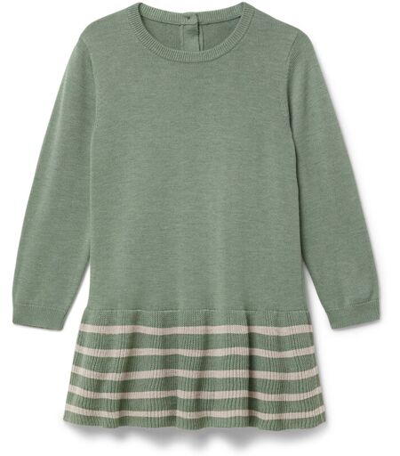 Kinder-Strickkleid mit RWS-zertifizierter Wolle Farbe: Salbeigrün, angesetzter Rock salbeigrün-hellbeige gestreift Material: 40% Polyamid, 30% Polyacryl, 24% Polyester, 6% Wolle (Merinowolle) Sonstige Hinweise: Größenlauf/Alter: Gr. 74/80 (ca. 6 – 12 M.) Gr. 86/ 92 (ca. 1 – 2 J.) Gr. 98/104 (ca. 2 – 4 J.) Gr. 110/116 (ca. 4 – 6 J.) Gr. 122/128 (ca. 6 – 8 J.) Weich und wärmend mit WolleGerader Schnitt mit langen ÄrmelnMit Rundhalsausschnitt und angesetztem Rock in Ripp-StrukturMit 2 Knöpfen auf der Rückseite zum einfachen An- und AusziehenDieses Produkt beinhaltet 6% RWS-zertifizierte Wolle, zertifiziert durch CU 809415Dieses Kleid achtet das Tierwohl von Schafen. ...