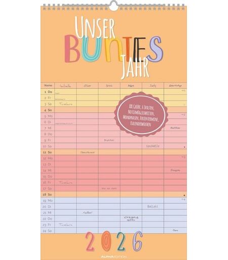 Mit dem Familienplaner „Unser buntes Jahr“ 2026 von Alpha Edition behalten Sie alle Termine Ihrer Familie im Blick. Der farbenfrohe Wandkalender im großzügigen Format ( 26 × 45 cm) überzeugt durch Übersichtlichkeit und modernes Design – ideal für Familienorganisation und Alltagsplanung. Highlights: 6 Spalten für die ganze Familie: Übersichtliche Eintragung von Terminen, Geburtstagen und Aktivitäten. Praktisches Format: 26 × 45 cm – bietet viel Platz für Eintragungen und bleibt dabei dekorativ. Feiertage & Mondphasen: Mit deutschsprachigem Kalendarium für DE/AT/CH – zuverlässig und übersichtlich. Robust & funktional: Mit Ringbindung zum einfachen Umblättern und stabilen Aufhängen. Nachhaltige Herstellung: Der Alpha Edition Familienplaner „Unser buntes Jahr“ 2026 ist nicht nur eine praktische Hilfe im Alltag, sondern auch ein echter Blickfang für Küche, Büro oder Flur. Ein Must-have für Familien, die Organisation bunt und fröhlich gestalten möchten. ...