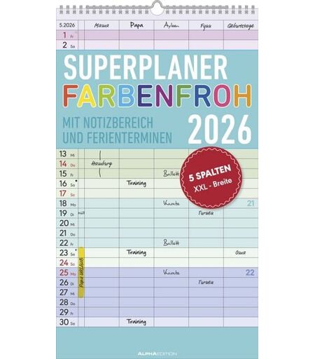 Neumann Verlage GmbH & Co. KG Superplaner Farbenfroh 2026 - 5 Spalten - Familienkalender 26x45 cm - Offset-Papier - mit Ferienterminen - Wandkalender - Wandplaner