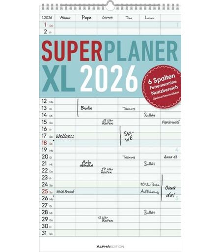 Neumann Verlage GmbH & Co. KG Superplaner XL 2026 6 Spalten - Familien-Timer 26x45 cm - Offset-Papier - mit Ferienterminen - Wand-Planer - Familienkalender - Alpha Edition