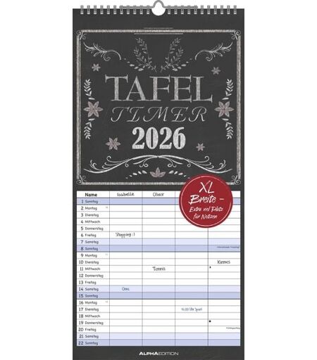Der Alpha Edition Tafel Timer Familienkalender 2026 bringt Übersicht und Stil in den Alltag. Mit vier großzügigen Spalten, farbenfrohem Kreidetafel-Design und vielen praktischen Zusatzinformationen behalten Familien, Paare oder WGs alle Termine perfekt im Blick. Highlights: Ansprechendes Design: Buntes Kreidetafel-Design mit jahreszeitlich passenden Illustrationen – dekorativ und funktional zugleich Umfassende Organisation: 4 Spalten für getrennte Eintragungen, inkl. Saisonkalender, Wetterprognosen, Pollenflugkalender, Postentgelte & mehr . Übersichtliche Monatsansicht: Klare Struktur mit deutschsprachigem Kalendarium, allen Feiertagen und Ferienterminen für DE/AT/CH Praktisches Format: 22 × 45 cm, Ringbindung zum einfachen Umblättern – ideal für Familien, Paare oder Wohngemeinschaften Der Alpha Edition Tafel Timer Familienkalender 2026 ist mehr als nur ein Planer – er ist ein zuverlässiger Helfer für eine perfekt organisierte Jahresplanung. ...