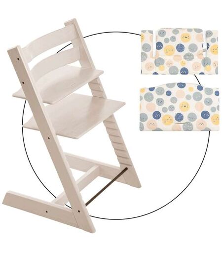 Mit dem Treppenhochstuhl Tripp Trapp von Stokke sitzen Kinder auf selbstverständliche Art und Weise ergonomisch. Das wohldurchdachte Design des Klassikers wächst individuell mit Deinem Kind mit und passt sich an seine Proportionen an. Mit seinem klassischen, legendären Design von Peter Opsvik ist der Tripp Trapp immer "en vogue". Jetzt auch im praktischen Bundle mit Sitzkissen! Material: europäisches Buchenholz, lackiert; Sitzkissen: Obermaterial aus reiner Baumwolle (Bio) Verstellbarkeit: höhen- und tiefenverstellbare Sitz- und Fußplatte Maße: 79(H) x 46(B) x 49(T) cm; Sitzbreite Sitzkissen: 27 cm Gewicht: 7 kg Altersempfehlung & Langzeitnutzen: ab 3 Jahren bis ins Erwachsenenalter (belastbar bis 136 kg); ab Geburt mit Tripp Trapp Newborn Set (separat erhältlich), ab 6 Monaten mit Tripp Trapp Baby-Set (separat erhältlich) Lieferumfang: Treppenhochstuhl Tripp Trapp mit Sitz- und Fußplatte, Sitzkissen Classic im Design Soul System (weiteres Zubehör ist separat erhältlich) Kommunikation auf Augenhöhe Preisgekrönt und seit 1972 absolut überzeugend: Mit dem Treppenhochstuhl Tripp Trapp nimmt der Nachwuchs direkt am Geschehen des Familientischs teil. Das Kind kommuniziert auf Augenhöhe mit den Erwachsenen und schult seine sprachlichen und sozialen Kompetenzen. Ob beim Essen, Malen oder Basteln – das Kleine ist immer dabei und genießt die Gesellschaft der Großen. Funktionales Design für gesundes Sitzen Sowohl die Sitz- als auch die Fußplatte des Stuhls sind flexibel in der Höhe und Tiefe verstellbar. Unabhängig vom Alter und der Körpergröße des Kindes wird so eine nahezu perfekte Sitzposition möglich. Sind die Abstände zwischen Lehne, Sitzfläche und Fußplatte optimal eingestellt, sitzt das Kind entspannt. Der untere Rücken wird unterstützt, die Kniekehlen sind frei und die Unterarme liegen locker auf der Tischplatte. Die Füße können aufgestellt werden, sodass das Körpergewicht verlagert werden kann. Bewegung am Tisch ist durchaus erlaubt. Nur wer dynamisch sitzt, sitzt gesund und so bequem, dass er sich auf das Erlernen neuer Fertigkeiten konzentrieren kann. Sitz- und Fußplatte lassen sich unkompliziert separat voneinander einstellen. So wächst der Hochstuhl individuell im Tempo des Kindes bis ins Erwachsenenalter mit. Das massive Buchenholz trägt problemlos bis zu 136 Kilogramm. Nachhaltig und verantwortungsbewusst produziert Gemäß der Firmenphilosophie ist der Treppenhochstuhl ausschließlich aus biologisch abbaubaren und besonders umweltverträglichen Materialien produziert. Das europäische Buchenholz erweist sich als strapazierfähig und langlebig. Der verwendete Lack ist wasserbasiert und frei von Bisphenol und Phtalaten. Bei Bedarf lässt sich das lackierte Holz unkompliziert mit einem feuchten Tuch reinigen. Sitzkissen Classic Das Sitzkissen macht den praktischen Tripp Trapp durch eine leichte Wattierung bequem, ohne dabei die Bewegungsfreiheit Deines Kindes einzuschränken. Es lässt sich schnell und einfach befestigen und auch wieder... ...