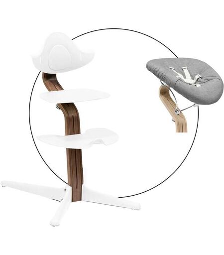 Der Hochstuhl Nomi von Stokke begleitet Dein Kind ein Leben lang. Dank seiner stufenlosen Verstellbarkeit passt er sich an jede Lebensphase optimal an und ermöglicht eine entspannte Interaktion am Familientisch. Das skandinavische Design mit einem Mittelträger aus Walnussholz und kontraststarken Kunststoff-Elementen begeistert auf den ersten Blick. Jetzt auch im praktischen Bundle mit dem Nomi Newborn-Set! Altersempfehlung: ab 3 Jahren; ab Geburt mit Newborn-Set; ab 6 Monaten mit Baby-Set (separat erhältlich); belastbar bis 110 kg Material: Hochstuhl: Mittelträger Walnussholz, Rückenlehne, Sitz, Fußstütze und Fußkreuz: Polypropylen, Schrauben: Metall; Newborn-Set: Polypropylen, kohlenstoffarmer DIN-Stahl, Netzgewebe 100 % Polyester, Textil-Set: Bezug 85 % Polyester, 15 % Baumwolle, Füllung 100 % Polyester, Netzgewebe 100 % Polyester Verstellbarkeit: stufenlose Anpassung; Newborn-Set mit stufenlos verstellbarem Neigungswinkel Sicherheit: kippsichere Rollen; Newborn-Set mit längenverstellbarem 5-Punkt-Sicherheitsgurt Lieferumfang: Hochstuhl-Montage-Set Nomi von Stokke inkl. Rückenlehne, Mittelträger, Fußkreuz, Fußplatte, Sitz, Nomi Newborn-Set mit Netzgewebe, Textil-Set und 5-Punkt-Gurt Dank seiner stufenlosen Anpassung ohne zusätzliches Werkzeug bietet der Hochstuhl einen ergonomischen Sitz in jeder Phase des Lebens. Ohne weiteres Zubehör kann er ab drei Jahren verwendet werden, mit dem im Lieferumfang enthaltenen Newborn-Set bereits ab Geburt. Ein gleichnamiges Baby-Set für Kinder ab sechs Monaten und ein Sitzkissen des Herstellers sind separat erhältlich. Peter Opsvik hat Nomi basierend auf der gleichen Idee wie den Stuhl Tripp Trapp kreiert: Dein Mini kann die Mahlzeiten entspannt, auf Augenhöhe mit den anderen Familienmitgliedern wahrnehmen und interagieren. Zugleich fällt es ihm leichter, sich auf die Aktivitäten rund um den Tisch zu konzentrieren. Die physische Umgebung wird sozusagen an die Größe des Kindes und seine Bedürfnisse angepasst. Die stabile Fußstütze sorgt für zusätzlichen Komfort. Auch sie lässt sich entsprechend dem Wachstum verstellen. Die Tiefe wird automatisch angepasst, wenn Du die Höhe von Sitz und Fußstütze fixierst. Der Mittelträger verleiht dem Hochstuhl eine stabile Festigkeit, eine lange Haltbarkeit und große Flexibilität. Aufgrund seines geringen Gewichts lässt sich der Stuhl überall und in jedem Zimmer verwenden. Mit den leichtlaufenden Rollen gestaltet sich der Transport von einem Raum in den nächsten unkompliziert. Besonders praktisch: Zur Reinigung des Bodens nach dem Essen kannst Du den Nomi an der Tischkante aufhängen. Der Stuhl kann mit bis zu 110 Kilogramm belastet werden. Sein klares nordisches Design fügt sich in zahlreiche Wohnungseinrichtungen perfekt ein. Der Mittelträger des Hochstuhls wird aus Walnussholz gefertigt. So ergibt sich ein markanter Kontrast zu den farblich abgesetzten Kunststoff-Elementen. Nomi Newborn-Set Mit dem Newborn Set für den Hochstuhl Nomi von Stokke ist Dein Baby immer... ...