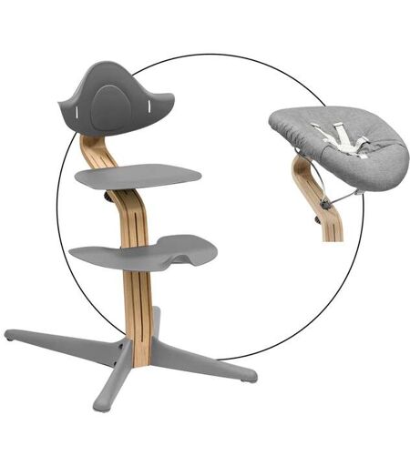Der Hochstuhl Nomi von Stokke begleitet Dein Kind ein Leben lang. Dank seiner stufenlosen Verstellbarkeit passt er sich an jede Lebensphase optimal an und ermöglicht eine entspannte Interaktion am Familientisch. Das skandinavische Design mit einem Mittelträger aus Eiche und kontraststarken Kunststoff-Elementen begeistert auf den ersten Blick. Jetzt auch im praktischen Bundle mit dem Nomi Newborn-Set! Altersempfehlung: ab 3 Jahren; ab Geburt mit Newborn-Set; ab 6 Monaten mit Baby-Set (separat erhältlich); belastbar bis 110 kg Material: Hochstuhl: Mittelträger Eiche, Rückenlehne, Sitz, Fußstütze und Fußkreuz: Polypropylen, Schrauben: Metall; Newborn-Set: Polypropylen, kohlenstoffarmer DIN-Stahl, Netzgewebe 100 % Polyester, Textil-Set: Bezug 85 % Polyester, 15 % Baumwolle, Füllung 100 % Polyester, Netzgewebe 100 % Polyester Verstellbarkeit: stufenlose Anpassung; Newborn-Set mit stufenlos verstellbarem Neigungswinkel Sicherheit: kippsichere Rollen; Newborn-Set mit längenverstellbarem 5-Punkt-Sicherheitsgurt Lieferumfang: Hochstuhl-Montage-Set Nomi von Stokke inkl. Rückenlehne, Mittelträger, Fußkreuz, Fußplatte, Sitz, Nomi Newborn-Set mit Netzgewebe, Textil-Set und 5-Punkt-Gurt Dank seiner stufenlosen Anpassung ohne zusätzliches Werkzeug bietet der Hochstuhl einen ergonomischen Sitz in jeder Phase des Lebens. Ohne weiteres Zubehör kann er ab drei Jahren verwendet werden, mit dem im Lieferumfang enthaltenen Newborn-Set bereits ab Geburt. Ein gleichnamiges Baby-Set für Kinder ab sechs Monaten und ein Sitzkissen des Herstellers sind separat erhältlich. Peter Opsvik hat Nomi basierend auf der gleichen Idee wie den Stuhl Tripp Trapp kreiert: Dein Mini kann die Mahlzeiten entspannt, auf Augenhöhe mit den anderen Familienmitgliedern wahrnehmen und interagieren. Es fällt ihm leichter, sich auf die Aktivitäten rund um den Tisch zu konzentrieren. Die physische Umgebung wird sozusagen an die Größe des Kindes und seine Bedürfnisse angepasst. Die stabile Fußstütze sorgt für zusätzlichen Komfort. Auch sie lässt sich entsprechend dem Wachstum verstellen. Die Tiefe wird automatisch angepasst, wenn Du die Höhe von Sitz und Fußstütze fixierst. Der Mittelträger verleiht dem Hochstuhl eine stabile Festigkeit, eine lange Haltbarkeit und große Flexibilität. Aufgrund seines geringen Gewichts lässt sich der Stuhl überall und in jedem Zimmer verwenden. Mit den leichtlaufenden Rollen gestaltet sich der Transport von einem Raum in den nächsten unkompliziert. Besonders praktisch: Zur Reinigung des Bodens nach dem Essen kannst Du den Stuhl an der Tischkante aufhängen. Der Nomi kann mit bis zu 110 Kilogramm belastet werden. Sein klares nordisches Design fügt sich in zahlreiche Wohnungseinrichtungen perfekt ein. Der Mittelträger des Hochstuhls wird aus Eiche gefertigt. So ergibt sich ein markanter Kontrast zu den farblich abgesetzten Kunststoff-Elementen. Nomi Newborn-Set Mit dem Newborn Set für den Hochstuhl Nomi von Stokke ist Dein Baby immer mitten im Geschehen. Der... ...