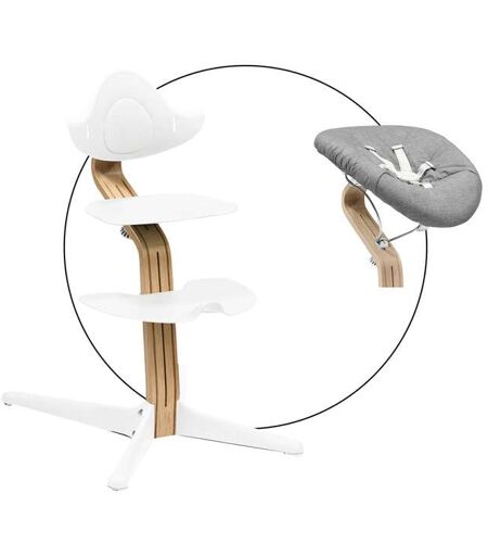 Der Hochstuhl Nomi von Stokke begleitet Dein Kind ein Leben lang. Dank seiner stufenlosen Verstellbarkeit passt er sich an jede Lebensphase optimal an und ermöglicht eine entspannte Interaktion am Familientisch. Das skandinavische Design mit einem Mittelträger aus Eiche und kontraststarken Kunststoff-Elementen begeistert auf den ersten Blick. Jetzt auch im praktischen Bundle mit dem Nomi Newborn-Set! Altersempfehlung: ab 3 Jahren; ab Geburt mit Newborn-Set; ab 6 Monaten mit Baby-Set (separat erhältlich); belastbar bis 110 kg Material: Hochstuhl: Mittelträger Eiche, Rückenlehne, Sitz, Fußstütze und Fußkreuz: Polypropylen, Schrauben: Metall; Newborn-Set: Polypropylen, kohlenstoffarmer DIN-Stahl, Netzgewebe 100 % Polyester, Textil-Set: Bezug 85 % Polyester, 15 % Baumwolle, Füllung 100 % Polyester, Netzgewebe 100 % Polyester Verstellbarkeit: stufenlose Anpassung; Newborn-Set mit stufenlos verstellbarem Neigungswinkel Sicherheit: kippsichere Rollen; Newborn-Set mit längenverstellbarem 5-Punkt-Sicherheitsgurt Lieferumfang: Hochstuhl-Montage-Set Nomi von Stokke inkl. Rückenlehne, Mittelträger, Fußkreuz, Fußplatte, Sitz, Nomi Newborn-Set mit Netzgewebe, Textil-Set und 5-Punkt-Gurt Dank seiner stufenlosen Anpassung ohne zusätzliches Werkzeug bietet der Hochstuhl einen ergonomischen Sitz in jeder Phase des Lebens. Ohne weiteres Zubehör kann er ab drei Jahren verwendet werden, mit dem im Lieferumfang enthaltenen Newborn-Set bereits ab Geburt. Ein gleichnamiges Baby-Set für Kinder ab sechs Monaten und ein Sitzkissen des Herstellers sind separat erhältlich. Peter Opsvik hat Nomi basierend auf der gleichen Idee wie den Stuhl Tripp Trapp kreiert: Dein Mini kann die Mahlzeiten entspannt, auf Augenhöhe mit den anderen Familienmitgliedern wahrnehmen und interagieren. Es fällt ihm leichter, sich auf die Aktivitäten rund um den Tisch zu konzentrieren. Die physische Umgebung wird sozusagen an die Größe des Kindes und seine Bedürfnisse angepasst. Die stabile Fußstütze sorgt für zusätzlichen Komfort. Auch sie lässt sich entsprechend dem Wachstum verstellen. Die Tiefe wird automatisch angepasst, wenn Du die Höhe von Sitz und Fußstütze fixierst. Der Mittelträger verleiht dem Hochstuhl eine stabile Festigkeit, eine lange Haltbarkeit und große Flexibilität. Aufgrund seines geringen Gewichts lässt sich der Stuhl überall und in jedem Zimmer verwenden. Mit den leichtlaufenden Rollen gestaltet sich der Transport von einem Raum in den nächsten unkompliziert. Besonders praktisch: Zur Reinigung des Bodens nach dem Essen kannst Du den Stuhl an der Tischkante aufhängen. Der Nomi kann mit bis zu 110 Kilogramm belastet werden. Sein klares nordisches Design fügt sich in zahlreiche Wohnungseinrichtungen perfekt ein. Der Mittelträger des Hochstuhls wird aus Eiche gefertigt. So ergibt sich ein markanter Kontrast zu den farblich abgesetzten Kunststoff-Elementen. Nomi Newborn-Set Mit dem Newborn Set für den Hochstuhl Nomi von Stokke ist Dein Baby immer mitten im Geschehen. Der... ...