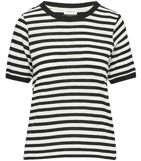 Damen T-Shirt aus Baumwoll-Modal-Mischung Rundhalsausschnitt Kurzarm mit Strickbündchen Ringelmuster Gerade Passform Farbbezeichnung: Grey / Black Material: 50% Baumwolle, 50% Modal Die Marke Comma ist Mitglied der Fair Wear Foundation. ...